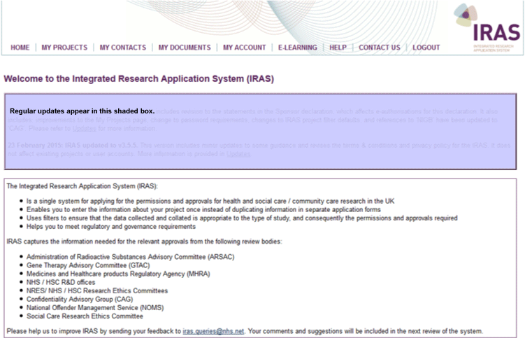 When new versions of IRAS are launched you will be given information about the update within the shaded section of the IRAS home page